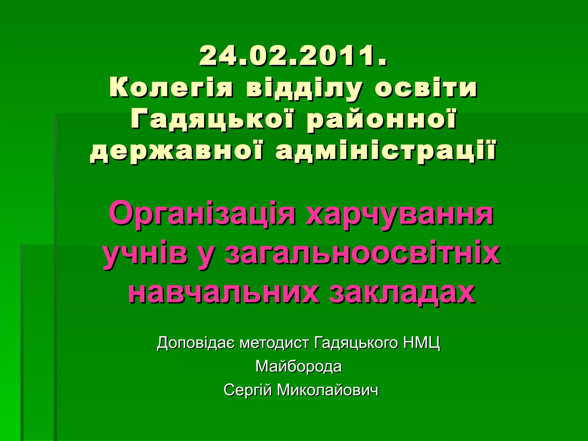24.02.2011. Колегія відділуосвіти Гадяцької районної державної адміністрації Організація харчування учнів у загальноосвітніх навчальних закладах Доповідає методист Гадяцького НМЦ Майборода Сергій Миколайович