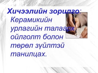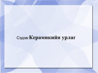 Материал нь: Керамикийнурлагын хамгийн түгээмэл хэрэглэгддэг материал нь байгалийн шавар шороо бөгөөд тэр нь нягт сайтай, тослогдуу, галд тэсвэртэй байдаг онцлогтой. Ийм шороог энгийн гар аргаар буюу үйлдвэрийн аргаар боловсруулдаг. -өнгөн хөрсний хар шороо нь керамик болж чадахгүй -керамикийн шавар шороо нь цагаан, цайвар улаан, улаан хүрэн, ногоон, цайвар шаргал гэх мэт өнгийн шороонууд байдаг. - 13.