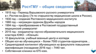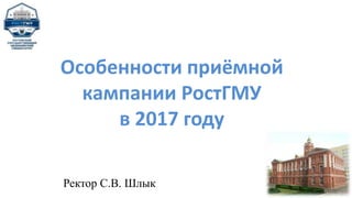 Документ описывает особенности приёмной кампании РостГМУ на 2017 год, включая информацию о числе мест для поступления, правилах и сроках приёма документов, а также о целевом наборе. В указанный период университет предоставляет обучение по множеству медицинских направлений с указанием условий зачисления и перечня необходимых документов. Также рассматриваются индивидуальные достижения абитуриентов и их влияние на конкурсные баллы.