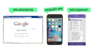 Документ обсуждает эру чат-ботов и мессенджеров, подчеркивая их роль в различных сферах, таких как доставка еды и обслуживание клиентов. Приводятся инвестиции и статистика использования чат-ботов в России и мире, а также потребительские предпочтения по получению информации через чаты. Упоминаются будущие перспективы и различные применения чат-ботов в маркетинге и развлечении.