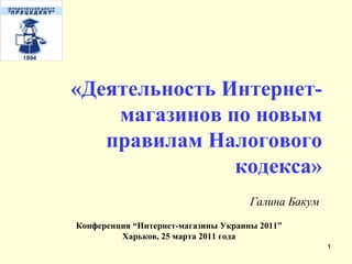 Документ рассматривает деятельность интернет-магазинов в Украине в контексте новых правил налогообложения и законодательства об электронной коммерции. Обсуждаются изменения в налоговой системе, источники правовой документации и требования к интернет-бизнесу, а также обязательства предпринимателей по оформлению и налогообложению. Конференция акцентирует внимание на реформах, внесенных в 2011 году, и их последствиях для электронных торговых платформ.