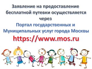 Документ описывает организацию летнего отдыха для детей в Москве в 2017 году, включая программу «Московская смена», которая предлагает бесплатные путевки для школьников от 7 до 14 лет. Лагерь будет работать в три смены с обеспечением трехразового питания и легким процессом оформления документов. Также упоминается измененный порядок предоставления путевок для детей льготных категорий и акцентируется внимание на интерактивной карте мест отдыха.