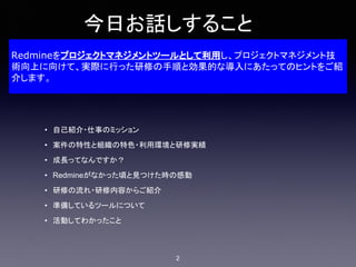 成長ってなんですか? • Redmineがなかった頃と見つけた時の感動 • 研修の流れ・研修内容からご紹介 • 準備しているツールについて • 活動してわかったこと 2 Redmineをプロジェクトマネジメントツールとして利用し、プロジェクトマネジメント技 術向上に向けて、実際に行った研修の手順と効果的な導入にあたってのヒントをご紹 介します。