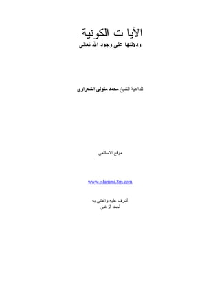 ﺍﻵﻴﺎﻭﺩﻻﻟﺘﻬﺎ ﻋﻠﻰ ﻭﺟﻮﺩ ﺍﷲ ﺗﻌﺎﻟﻰ-ﻣﺤﻤﺪ ﻣﺘﻮﻟﻲ ﺍﻟﺸﻌﺮﺍﻭﻱ ﺍﻟﻤﻘﺩﻤﺔ..........................................................................................................................................1 ﺍﻟﻔﺼﻞ ﺍﻷﻭﻝﻟﻤﺎﺫﺍ ﺍﻷﺩﻟﺔ ﺍﻟﻤﺎﺩﻳﺔ ﻭﺍﻟﻜﻮﻥ................................................................................................2 ﺍﻷﺩﻟﺔ ﻧﻮﻋﺎﻥ..............................................................................................................................2 ﺩﻟﻴﻞ ﺍﻟﺨﻠﻖ.................................................................................................................................4 ﺍﻟﺘﺤﺪﻱ ﺍﻻﻟﻬﻲ ﻓﻲ ﺍﻟﺨﻠﻖ................................................................................................................6 ﺩﻟﻴﻞ ﺍﻟﺜﺎﺑﺖ ﻭﺍﻟﻤﺘﺤﺮﻙ..................................................................................................................7 ﻃﻼﻗﺔ ﺍﻟﻘﺪﺭﺓ ﻓﻲ ﺍﻟﻜﻮﻥ.................................................................................................................8 ﺍﻟﻔﺼﻞ ﺍﻟﺜﺎﻧﻲﻳﻘﻮﻝ ﺍﷲ ﺳﺒﺤﺎﻧﻪ ﻭﺗﻌﺎﻟﻰ"ﻭﻓﻲ ﺃﻧﻔﺴﻜﻢ ﺃﻓﻼ ﺗﺒﺼﺮﻭﻥ"..........................................................11 ﺁﻳﺎﺕ ﺍﷲ ﻓﻲ ﺧﻠﻖ ﺍﻻﻧﺴﺎﻥ.............................................................................................................11 ﺃﻳﻦ ﺍﻟﺮﻭﺡ ﻓﻲ ﺟﺴﺪﻙ؟................................................................................................................13 ﻗﺪﺭﺍﺕ ﺍﻻﻧﺴﺎﻥ..........................................................................................................................13 ﺍﻻﺧﺘﻴﺎﺭ ﻭﺍﻟﻘﺪﺭﺓ........................................................................................................................15 ﺩﻟﻴﻞ ﺍﻟﻀﺤﻚ ﻭﺍﻟﺒﻜﺎء..................................................................................................................15 ﺃﻓﻌﺎﻝ ﺍﻻﻧﺴﺎﻥ...........................................................................................................................17 ﺍﻋﺠﺎﺯ ﺍﻟﻘﺮﺁﻥ...........................................................................................................................18 ﺍﻻﻧﺴﺎﻥ ﻭﺍﻟﺘﻤﻴﺰ.........................................................................................................................19 ﺍﻟﻔﺼﻞ ﺍﻟﺜﺎﻟﺚﺍﻟﺪﻟﻴﻞ ﺍﻟﻐﻴﺒﻲ...............................................................................................................21 ﺍﻟﻐﻴﺐ ﻧﻮﻋﺎﻥ............................................................................................................................21 ﺃﻣﺜﻠﺔ ﻣﻦ ﺍﻟﻘﺮﺁﻥ.........................................................................................................................23 ﺩﻟﻴﻞ ﺁﺧﺮ.................................................................................................................................25 ﺍﻟﻮﺟﻮﺩ ﻭﺍﺩﺭﺍﻙ ﺍﻟﻮﺟﻮﺩ...............................................................................................................26 ﺍﻟﻐﻴﺐ ﺣﻘﻴﻘﺔ.............................................................................................................................28 ﺍﷲ ﺃﺧﺒﺮﻧﺎ ﺑﻜﻨﻮﺯ ﺍﻷﺭﺽ.............................................................................................................29 ﺍﻟﻔﺼﻞ ﺍﻟﺮﺍﺑﻊﺍﻵﻳﺎﺕ ﺍﻷﺭﺿﻴﺔ ﻭﺩﻻﻟﺘﻬﺎ...............................................................................................31 ﻭﻓﻲ ﺍﻷﺭﺽ ﺁﻳﺎﺕ......................................................................................................................31 ﺍﻟﻌﻠﻢ ﻛﺎﺷﻒ ﻗﻮﺍﻧﻴﻦ ﺍﻟﻜﻮﻥ............................................................................................................33 ﻛﻌﻨﻰ ﻛﺮﻭﻳﺔ ﺍﻷﺭﺽ..................................................................................................................34 ﺍﻟﻠﻴﻞ ﻭﺍﻟﻨﻬﺎﺭ ﻭﺟﺪﺍ ﻣﻌﺎ................................................................................................................35 ﺍﻟﺴﻴﺮ ﻓﻲ ﺍﻷﺭﺽ......................................................................................................................38 ﻣﻌﺠﺰﺓ ﺍﻟﺨﻠﻖ ﻓﻲ ﺍﻟﺸﺠﺮ..............................................................................................................40 ﺍﻟﻔﺼﻞ ﺍﻟﺨﺎﻣﺲﺍﻷﺩﻟﺔ ﺍﻟﻤﺎﺩﻳﺔ ﻓﻲﺃﺻﻞ ﺍﻟﻜﻮﻥ ﻭﺃﺻﻞ ﺍﻻﻧﺴﺎﻥ...................................................................41 ﻓﻲ ﺍﻷﻧﻔﺲ ﻭﺍﻵﻓﺎﻕ.....................................................................................................................41 ﺧﻠﻖ ﺍﻟﺠﻨﻴﻦ ﻓﻲ ﺍﻟﻘﺮﺁﻥ................................................................................................................42 ﺍﻟﻨﻄﻔﺔ ﻭﺍﻟﻮﺭﺍﺛﺔ.........................................................................................................................44 ﺍﻷﺻﻞ ﺍﻟﻮﺍﺣﺪ ﻟﻠﻜﻮﻥ..................................................................................