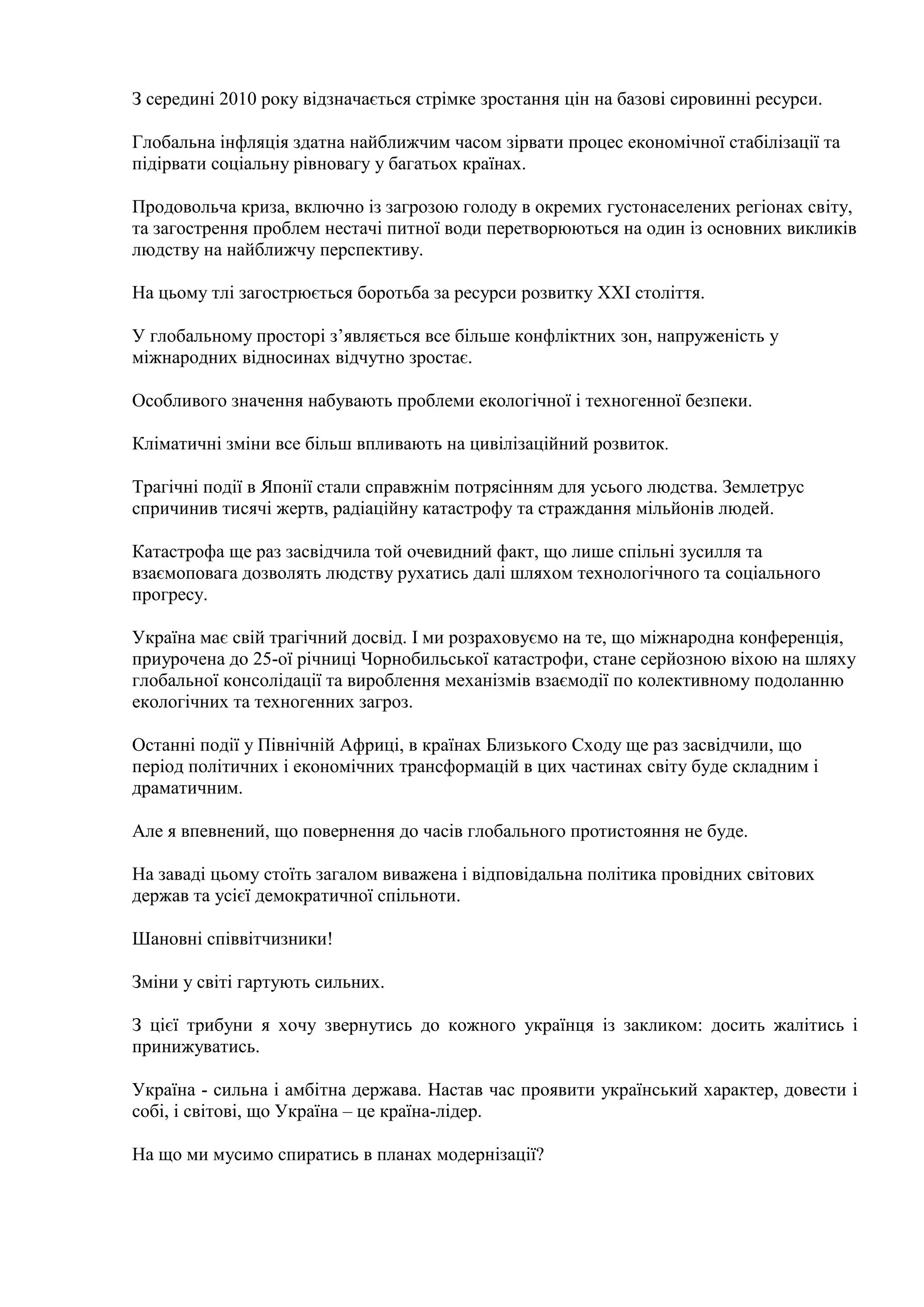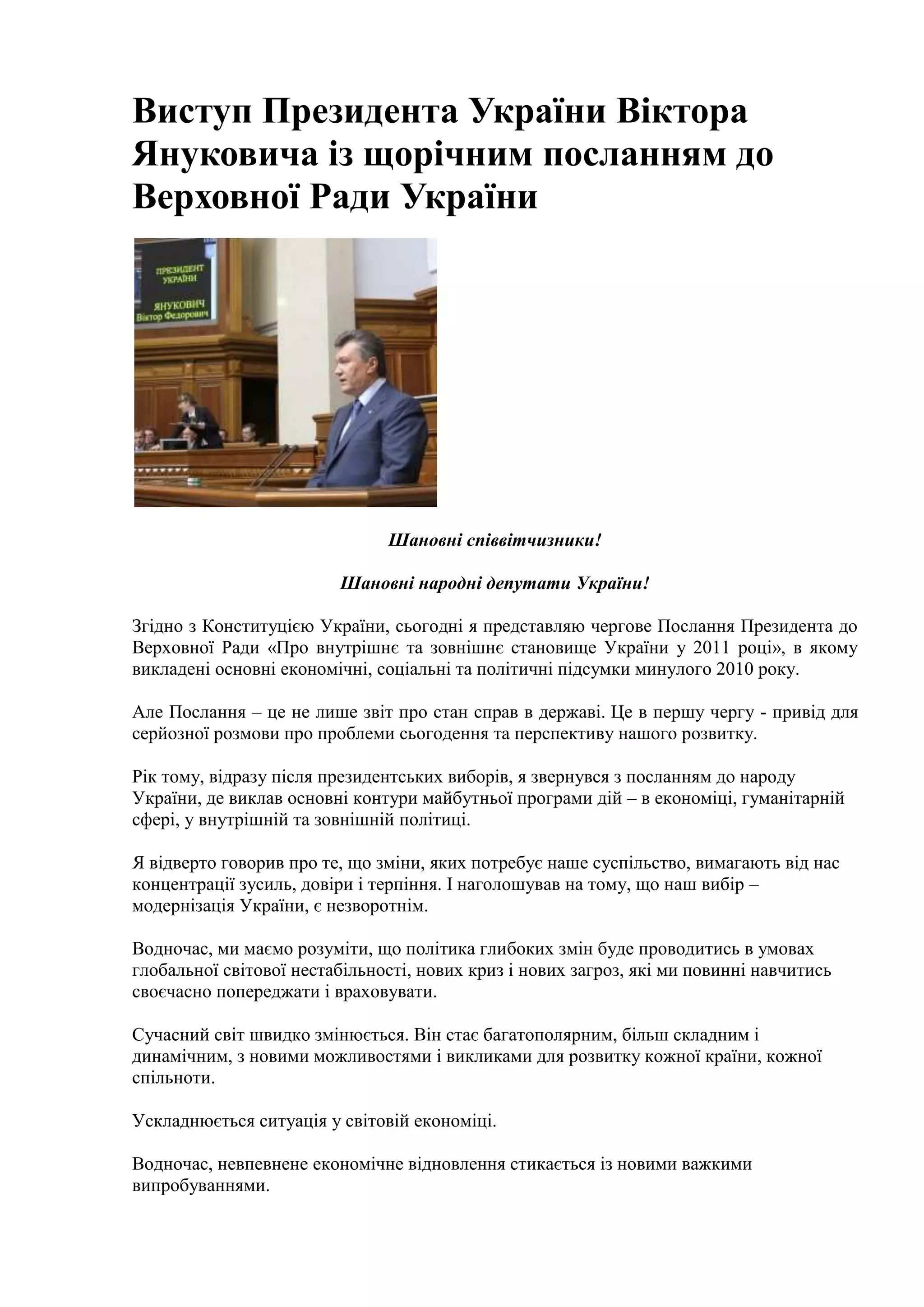 Виступ Президента УкраїниВіктора Януковича із щорічним посланням до Верховної Ради України<br />Шановні співвітчизники!<br />Шановні народні депутати України!<br />Згідно з Конституцією України, сьогодні я представляю чергове Послання Президента до Верховної Ради «Про внутрішнє та зовнішнє становище України у 2011 році», в якому викладені основні економічні, соціальні та політичні підсумки минулого 2010 року.<br />Але Послання – це не лише звіт про стан справ в державі. Це в першу чергу - привід для серйозної розмови про проблеми сьогодення та перспективу нашого розвитку.<br />Рік тому, відразу після президентських виборів, я звернувся з посланням до народу України, де виклав основні контури майбутньої програми дій – в економіці, гуманітарній сфері, у внутрішній та зовнішній політиці.<br />Я відверто говорив про те, що зміни, яких потребує наше суспільство, вимагають від нас концентрації зусиль, довіри і терпіння. І наголошував на тому, що наш вибір – модернізація України, є незворотнім.<br />Водночас, ми маємо розуміти, що політика глибоких змін буде проводитись в умовах глобальної світової нестабільності, нових криз і нових загроз, які ми повинні навчитись своєчасно попереджати і враховувати. <br />Сучасний світ швидко змінюється. Він стає багатополярним, більш складним і динамічним, з новими можливостями і викликами для розвитку кожної країни, кожної спільноти.<br />Ускладнюється ситуація у світовій економіці.<br />Водночас, невпевнене економічне відновлення стикається із новими важкими випробуваннями.<br />З середині 2010 року відзначається стрімке зростання цін на базові сировинні ресурси.<br />Глобальна інфляція здатна найближчим часом зірвати процес економічної стабілізації та підірвати соціальну рівновагу у багатьох країнах.<br />Продовольча криза, включно із загрозою голоду в окремих густонаселених регіонах світу, та загострення проблем нестачі питної води перетворюються на один із основних викликів людству на найближчу перспективу.<br />На цьому тлі загострюється боротьба за ресурси розвитку XXI століття.<br />У глобальному просторі з’являється все більше конфліктних зон, напруженість у міжнародних відносинах відчутно зростає.<br />Особливого значення набувають проблеми екологічної і техногенної безпеки.<br />Кліматичні зміни все більш впливають на цивілізаційний розвиток.<br />Трагічні події в Японії стали справжнім потрясінням для усього людства. Землетрус спричинив тисячі жертв, радіаційну катастрофу та страждання мільйонів людей.<br />Катастрофа ще раз засвідчила той очевидний факт, що лише спільні зусилля та взаємоповага дозволять людству рухатись далі шляхом технологічного та соціального прогресу. <br />Україна має свій трагічний досвід. І ми розраховуємо на те, що міжнародна конференція, приурочена до 25-ої річниці Чорнобильської катастрофи, стане серйозною віхою на шляху глобальної консолідації та вироблення механізмів взаємодії по колективному подоланню екологічних та техногенних загроз.<br />Останні події у Північній Африці, в країнах Близького Сходу ще раз засвідчили, що період політичних і економічних трансформацій в цих частинах світу буде складним і драматичним.<br />Але я впевнений, що повернення до часів глобального протистояння не буде.<br />На заваді цьому стоїть загалом виважена і відповідальна політика провідних світов