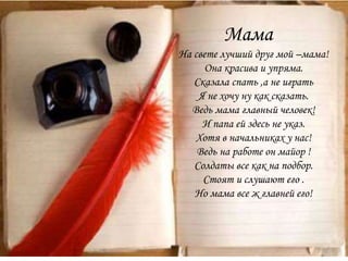 Документ посвящен восхищению автора мамой, которую он считает самым важным человеком в своей жизни. Освещается смена времен года, начиная с осени и заканчивая зимой, с описанием природы и чувств, связанных с ней. Текст передает теплоту и нежность, проявляемую к матери и окружающему миру.