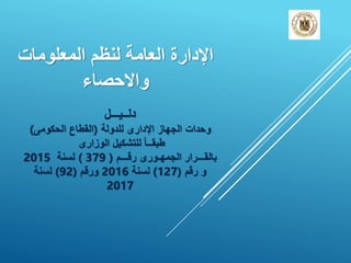 يتناول الدليل إرشادات تنظيمية حول الإدارة العامة لنظم المعلومات والإحصاء في القطاع الحكومي المصري، وذلك وفقًا للتشكيل الوزاري كما ورد في القرارات الجمهورية لعامي 2015 و2016 و2017. يتضمن الدليل معلومات حول مختلف الوزارات والمحافظات والجهات الحكومية، مع تفاصيل الاتصال وعناوينها. يهدف الدليل إلى تحسين كفاءة العمل الإداري وتقديم خدمات أفضل للمواطنين.