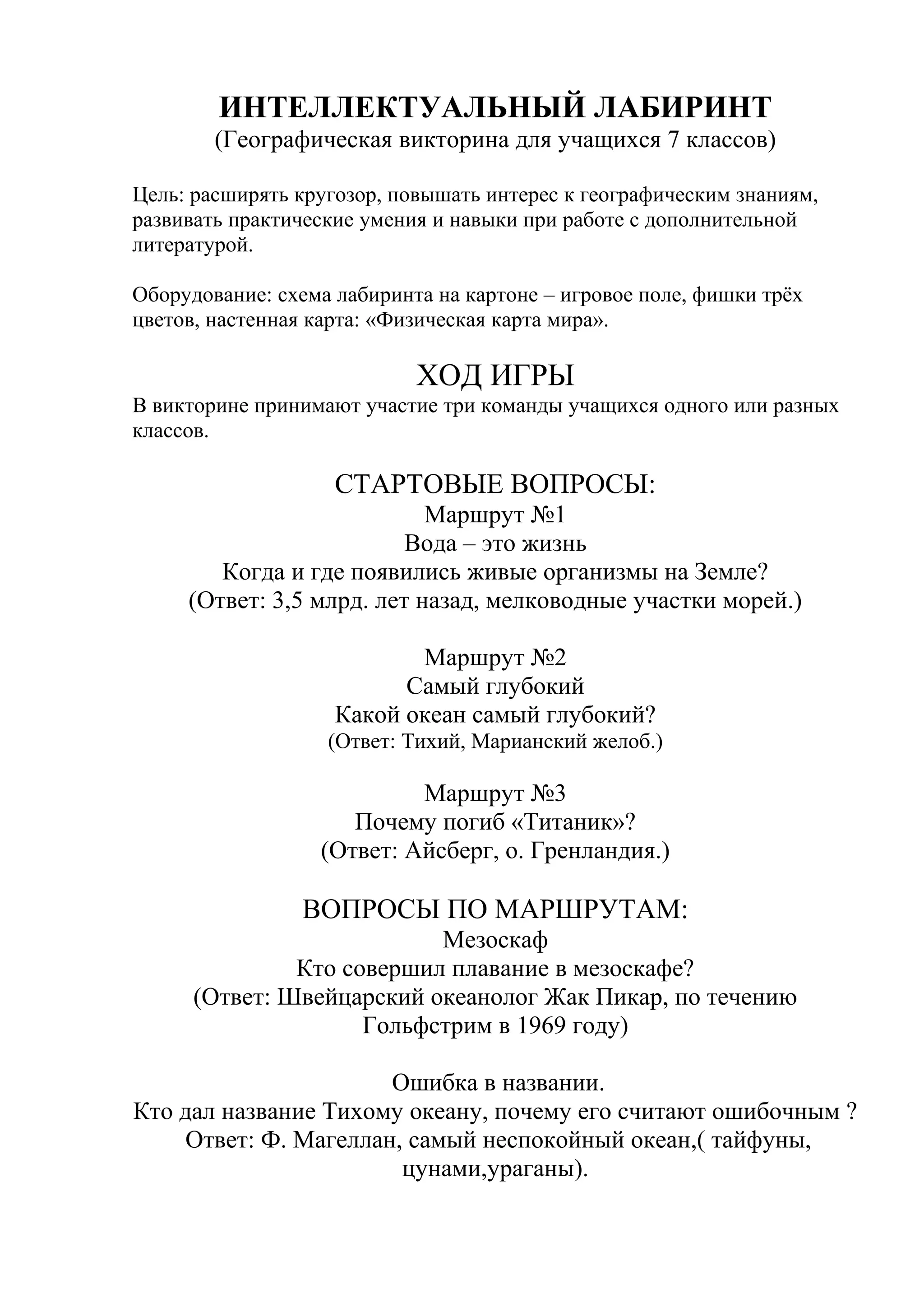 Документ представляет собой географическую викторину для учащихся 7 классов, целью которой является расширение кругозора и повышение интереса к географическим знаниям. Игра проходит на игровом поле с участием команд, которые отвечают на вопросы о географии. Вопросы касаются различных тем, включая океаны, исторические события и известных исследователей.