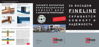 Документ представляет систему фасадов fineline от компании unilux, акцентируя внимание на их эстетике, энергоэффективности и использовании различных пород дерева. Упоминается высокая теплотехническая эффективность и соответствие современным требованиям по теплосбережению. Также подчеркивается разнообразие архитектурных решений и материалов, которые обеспечивают уникальность и долговечность систем.