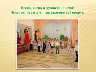 Документ описывает весеннее развлечение под названием «в гостях у бабушки алёны», организованное воспитателем для группы раннего возраста. В мероприятии участвуют дети, которые играют с солнцем, устраивают оркестр и взаимодействуют с бабушкой Аленой. Она приготовила сладости для всех присутствующих, подчеркивая праздничное и радостное настроение.
