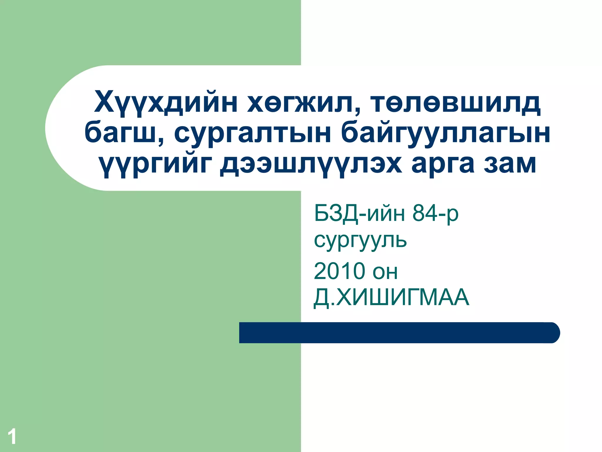 БЗД-ийн 84-р сургууль 20 10 он Д.ХИШИГМАА Хүүхдийн хөгжил, төлөвшилд багш, сургалтын байгууллагын үүргийг дээшлүүлэх арга зам - 2.