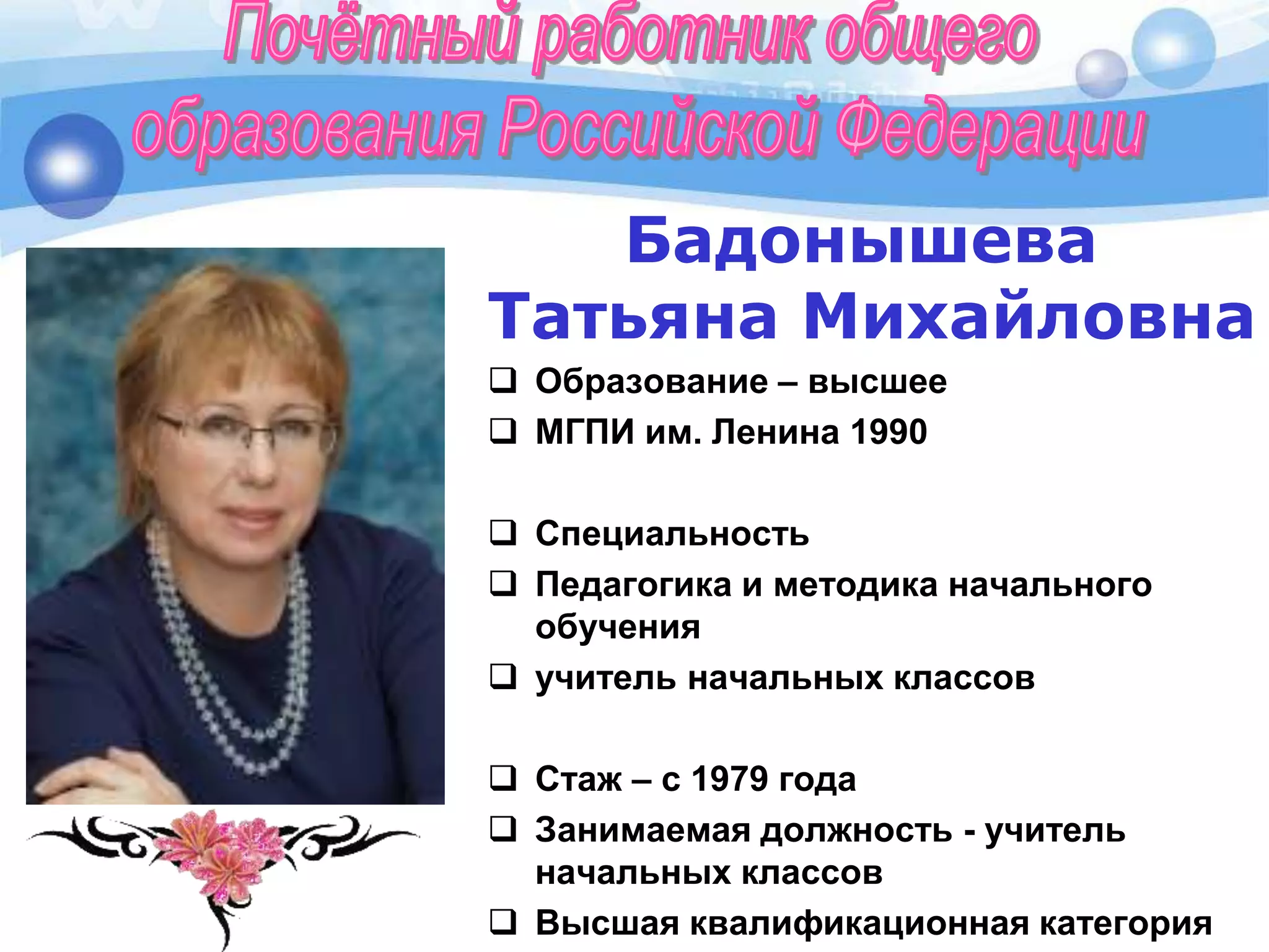 Бадонышева Татьяна Михайловна - учитель начальных классов с высшим образованием и стажем с 1979 года, специализирующийся на педагогике и методике начального обучения. В своей работе она акцентирует внимание на развитии любознательности у детей, их способности к самостоятельному поиску ответов и ответственности за собственные поступки. Также, она прошла курсы повышения квалификации и активно использует современные технологии в образовательном процессе.