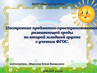 Документ описывает организацию предметно-пространственной развивающей среды во второй младшей группе дошкольного образования с учетом новых стандартов ФГОС. Основное внимание уделяется созданию доступной и привлекательной среды, способствующей максимальному развитию воспитанников через игру. В документе перечислены центры развития, поддерживающие социально-коммуникативные, познавательные, речевые, художественно-эстетические и физические навыки у детей.