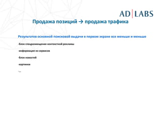Документ обсуждает тенденции и проблемы в области продажи трафика и позиций в поисковых системах, отмечая уменьшение видимости поисковой выдачи. Упомянуты плюсы и минусы сотрудничества как для исполнителей, так и для заказчиков, а также новые подходы, такие как продажа действий (PPA). Основное внимание уделяется важности качества сайтов и работы менеджеров для успешной продажи трафика и действий.