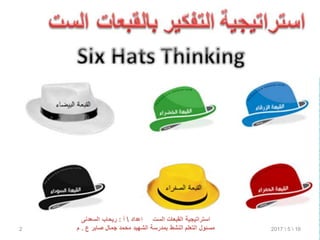 مقدمة استراتيجية القبعات الست للتفكير التي ابتكرها الطبيب البريطاني إدوارد دي بونو في عام 1985، تُساهم في تعزيز مهارات التفكير وتحليل المواضيع من زوايا متعددة. تشمل الاستراتيجية ستة قبعات تمثل أنماط تفكير مختلفة، مما يساعد الطلاب على تبني طرق جديدة لحل المشكلات واتخاذ القرارات. يتم استخدامها في الفصول الدراسية لتحفيز التفكير النقدي والإبداعي وجذب انتباه الطلاب.