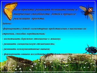 Документ описывает экологический проект для детей младшей группы на тему 'В мире насекомых', подготовленный Еленой Морозовой в 2016 году. Цель проекта — развивать познавательные, творческие способности и бережное отношение к природе у детей через изучение насекомых, их строения и роли в生态系. Ожидаемые результаты включают формирование у детей знаний о различных насекомых, их пользе и вреде, а также навыков исследовательской деятельности.