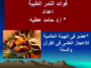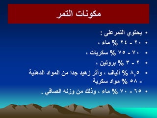 التمر يعد من الأغذية الغنية بالمكونات الصحية مثل السكريات والماء والبروتينات، وله فوائد متعددة تتعلق بالصيام والصحة العامة مثل دعم الجهاز الهضمي وتعزيز النشاط البدني والنفسي. يعتبر تناول التمر على الإفطار عادة مستحبّة، وله دور في تحسين صحة الفم وتخفيف التوتر. يمكنك استخدام التمر كجزء من نظام غذائي متوازن للتخفيف من مشكلات الوزن وعلاج اضطرابات صحية متعددة.