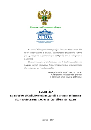 Документ описывает права детей с ограниченными возможностями здоровья в России, включая медицинское обслуживание, образование и трудовые права родителей. Он предоставляет информацию о процедурах получения статуса 'ребенок-инвалид', необходимых документах и социальных гарантиях, а также правовых основах для улучшения жилищных условий. Основное внимание уделяется доступности социальных услуг и правам, обеспеченным действующим законодательством.