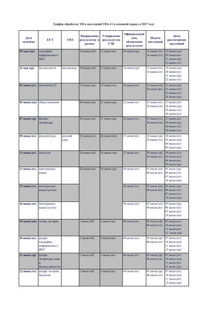 Документ содержит даты проведения экзаменов и резервных сессий для различных предметов, таких как биология, химия, литература и математика. Указаны также сроки подачи и рассмотрения апелляций, а также даты утверждения и направления результатов. В представленном графике проходят важные мероприятия для учеников на протяжении июня и июля.