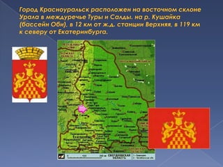 Документ представляет собой описание города Красноуральска, его истории, развития и значимых событий. Город был основан в результате добычи меди и золота, стал центром тяжелой индустрии с важными предприятиями, такими как красноуральский медеплавильный комбинат. Также упоминаются достопримечательности и современные проблемы города.