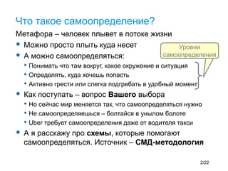 Документ обсуждает концепцию самоопределения в условиях быстроменяющегося мира, подчеркивая важность осознания окружающей среды и активного выбора направления в жизни. Автор, Максим Цепков, выделяет значимость самоопределения для личного и профессионального роста, а также предлагает схемы и инструменты, которые помогают в этом процессе. Он призывает участников к активному самоопределению как необходимому элементу успешной реализации в современном обществе.