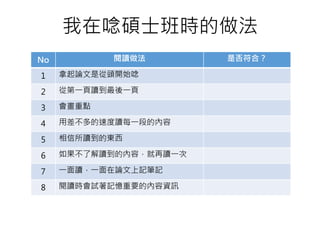 文档提供了一系列有效的论文阅读方法和技巧,包括如何从结构上理解论文和根据不同情况选择阅读的策略。作者分享了自身的学习与工作经历,强调了在阅读过程中对重要信息的记忆与笔记的重要性。整个文档还讨论了如何分析和批判性阅读研究结果,以便更好地应用于自己的研究中。
