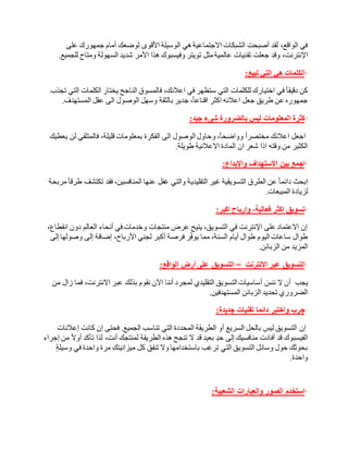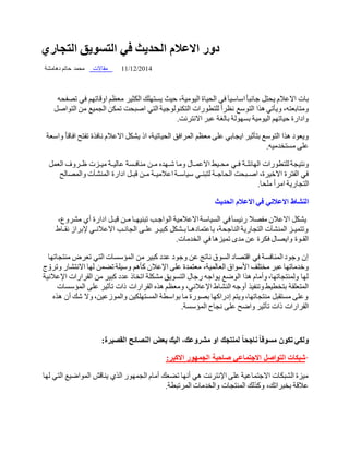 تتناول الوثيقة دور التسويق في العصر الحديث وتأكيد أهمية الإعلان في تحقيق النجاح التجاري. كما تشير إلى تأثير الإنترنت ووسائل التواصل الاجتماعي على استراتيجيات التسويق، وتحقيق فرص أكبر للوصول إلى العملاء وزيادة الأرباح.