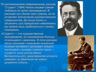 Рассказ А.П. Чехова 'Студент' (1894) считается одним из его самых любимых произведений, отображая изменение жизненной позиции главного героя, студента Ивана Великопольского. В рассказе, состоящем из трех страниц, автор исследует вопросы смысла жизни и предлагает положительное разрешение конфликта в душе персонажа. Студент, возвращаясь домой, трансформирует свое восприятие окружающего мира, проходя от негативного представления о жизни к осознанию ее гармонии и глубинного смысла.