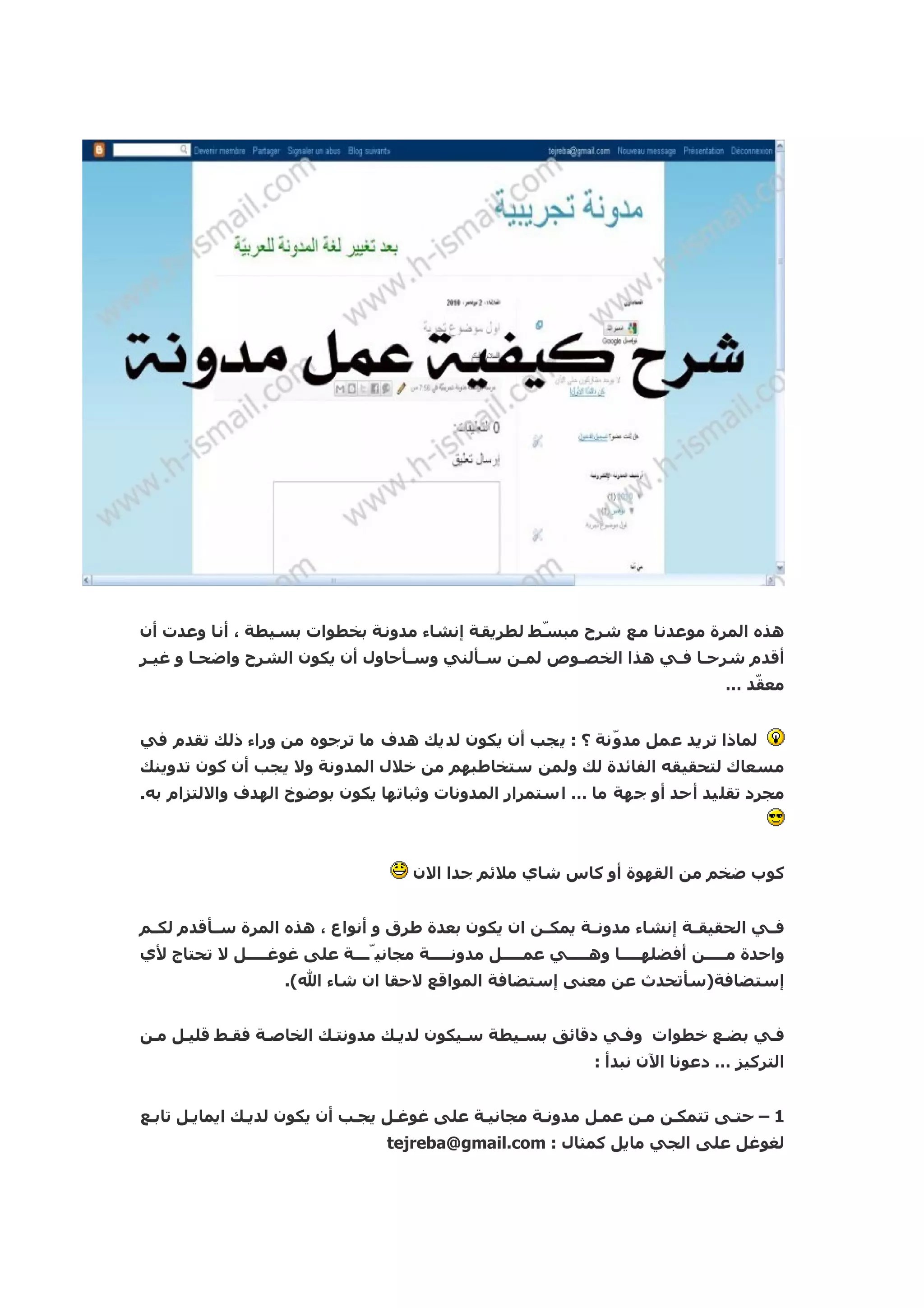 تتناول الوثيقة خطوات بسيطة لإنشاء مدونة مجانية على مدونة بلوجر، بدءًا من إعداد عنوان بريد إلكتروني على جيميل. توضح الخطوات اللازمة لتسجيل الدخول وإنشاء المدونة، بالإضافة إلى كيفية تخصيص تصميم المدونة. كما تسلط الضوء على أهمية وجود هدف واضح للتدوين والامتناع عن تقليد الآخرين.