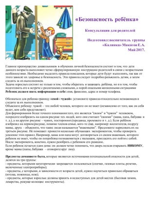 Документ предоставляет рекомендации для родителей по обучению детей дошкольного возраста основам личной безопасности. Основное внимание уделяется необходимости объяснять детям правила поведения в различных ситуациях, включая взаимодействие с незнакомыми людьми, опасными предметами и безопасным поведением на улице и в общественном транспорте. Рекомендации также включают упражнения для проверки усвоения правил и формирование понятия 'свой - чужой'.