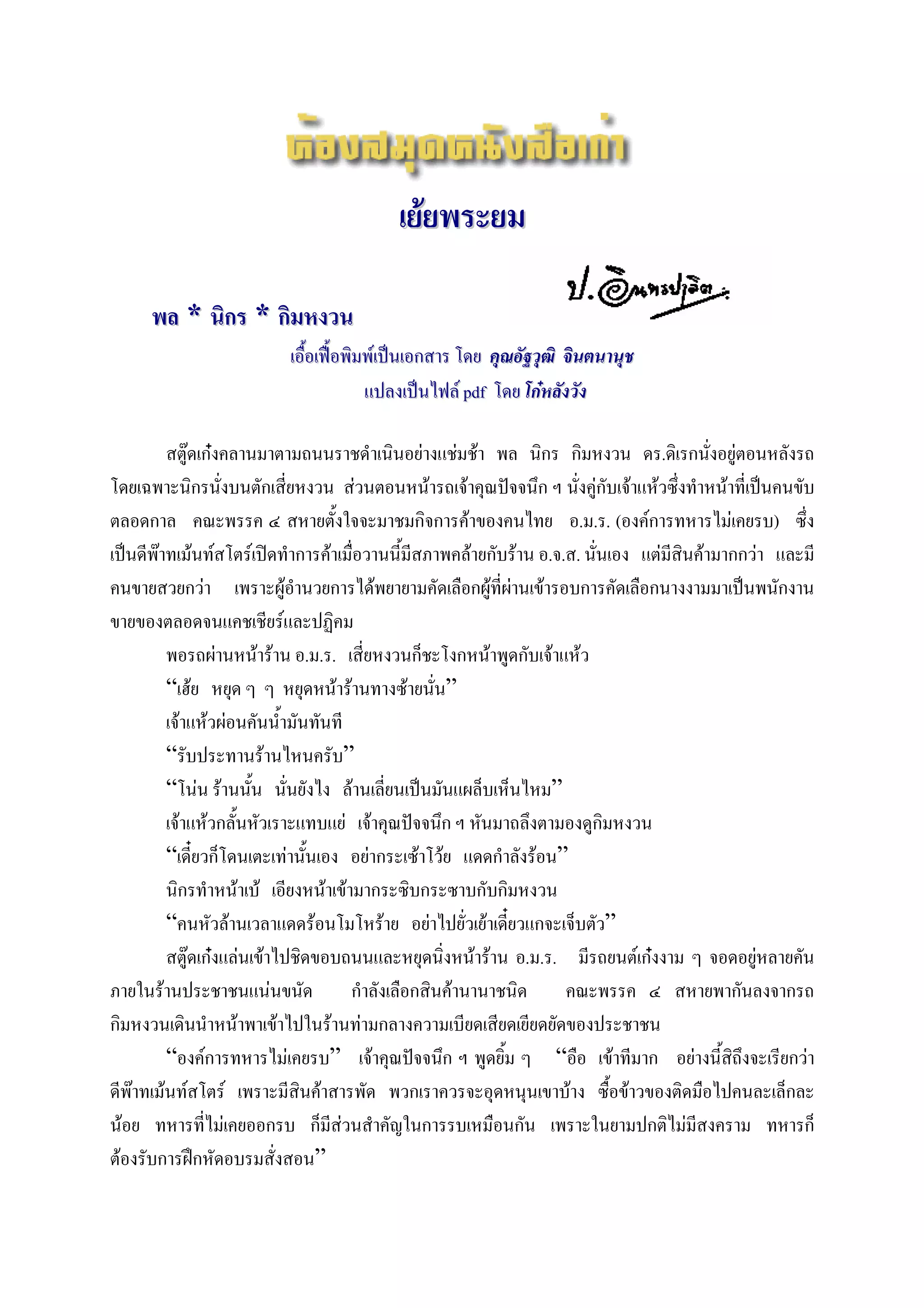 พล * นิกร * กิมหงวน เอื้อเฟอพิมพเปนเอกสาร โดย คุณอัฐวุฒิ จินตนานุช ณอั แปลงเปนไฟล pdf โดย โกหลังวัง สตูดเกงคลานมาตามถนนราชดําเนินอยางแชมชา พล นิกร กิมหงวน ดร.ดิเรกนังอยูตอนหลังรถ ่ โดยเฉพาะนิกรนั่งบนตักเสี่ยหงวน สวนตอนหนารถเจาคุณปจจนึก ฯ นั่งคูกับเจาแหวซึ่งทําหนาที่เปนคนขับ ตลอดกาล คณะพรรค ๔ สหายตั้งใจจะมาชมกิจการคาของคนไทย อ.ม.ร. (องคการทหารไมเคยรบ) ซึ่ง เปนดีพาทเมนทสโตรเปดทําการคาเมื่อวานนี้มีสภาพคลายกับราน อ.จ.ส. นั่นเอง แตมีสินคามากกวา และมี คนขายสวยกวา เพราะผูอํานวยการไดพยายามคัดเลือกผูที่ผานเขารอบการคัดเลือกนางงามมาเปนพนักงาน ขายของตลอดจนแคชเชียรและปฏิคม พอรถผานหนาราน อ.ม.ร. เสี่ยหงวนก็ชะโงกหนาพูดกับเจาแหว “เฮย หยุด ๆ ๆ หยุดหนารานทางซายนั่น” เจาแหวผอนคันน้ํามันทันที “รับประทานรานไหนครับ” “โนน รานนัน นั่นยังไง ลานเลี่ยนเปนมันแผล็บเห็นไหม” ้ เจาแหวกลั้นหัวเราะแทบแย เจาคุณปจจนึก ฯ หันมาถลึงตามองดูกิมหงวน “เดี๋ยวก็โดนเตะเทานันเอง อยากระเซาโวย แดดกําลังรอน” ้ นิกรทําหนาเบ เอียงหนาเขามากระซิบกระซาบกับกิมหงวน “คนหัวลานเวลาแดดรอนโมโหราย อยาไปยั่วเยาเดียวแกจะเจ็บตัว” ๋ สตูดเกงแลนเขาไปชิดขอบถนนและหยุดนิ่งหนาราน อ.ม.ร. มีรถยนตเกงงาม ๆ จอดอยูหลายคัน ภายในรานประชาชนแนนขนัด กําลังเลือกสินคานานาชนิด คณะพรรค ๔ สหายพากันลงจากรถ กิมหงวนเดินนําหนาพาเขาไปในรานทามกลางความเบียดเสียดเยียดยัดของประชาชน “องคการทหารไมเคยรบ” เจาคุณปจจนึก ฯ พูดยิ้ม ๆ “อือ เขาทีมาก อยางนี้สิถึงจะเรียกวา ดีพาทเมนทสโตร เพราะมีสินคาสารพัด พวกเราควรจะอุดหนุนเขาบาง ซื้อขาวของติดมือไปคนละเล็กละ นอย ทหารที่ไมเคยออกรบ ก็มีสวนสําคัญในการรบเหมือนกัน เพราะในยามปกติไมมีสงคราม ทหารก็ ตองรับการฝกหัดอบรมสั่งสอน”