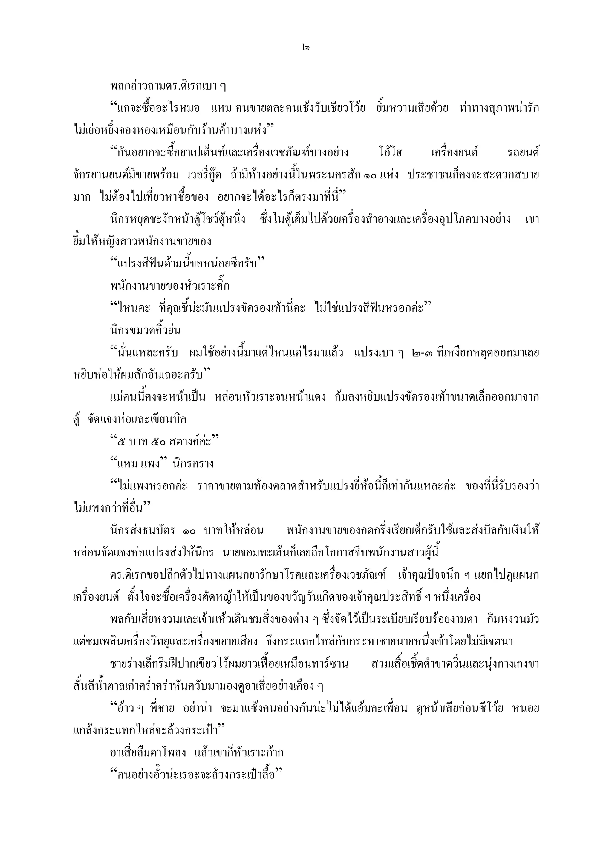 พลกลาวถามดร.ดิเรกเบา ๆ “แกจะซื้ออะไรหมอ แหม คนขายตละคนเชงวับเชียวโวย ยิ้มหวานเสียดวย ทาทางสุภาพนารัก ไมเยอหยิ่งจองหองเหมือนกับรานคาบางแหง” “กันอยากจะซื้อยาเปเต็นทและเครื่องเวชภัณฑบางอยาง โอโฮ เครื่องยนต รถยนต จักรยานยนตมขายพรอม เวอรี่กูด ถามีหางอยางนี้ในพระนครสัก ๑๐ แหง ประชาชนก็คงจะสะดวกสบาย ี มาก ไมตองไปเที่ยวหาซื้อของ อยากจะไดอะไรก็ตรงมาที่นี่” นิกรหยุดชะงักหนาตูโชวตหนึ่ง ซึ่งในตูเต็มไปดวยเครื่องสําอางและเครื่องอุปโภคบางอยาง เขา ู ยิ้มใหหญิงสาวพนักงานขายของ “แปรงสีฟนดามนี้ขอหนอยซีครับ” พนักงานขายของหัวเราะคิ๊ก “ไหนคะ ที่คณชี้นะมันแปรงขัดรองเทานีคะ ไมใชแปรงสีฟนหรอกคะ” ุ ่ นิกรขมวดคิวยน้ “นั่นแหละครับ ผมใชอยางนี้มาแตไหนแตไรมาแลว แปรงเบา ๆ ๒-๓ ทีเหงือกหลุดออกมาเลย หยิบหอใหผมสักอันเถอะครับ” แมคนนี้คงจะหนาเปน หลอนหัวเราะจนหนาแดง กมลงหยิบแปรงขัดรองเทาขนาดเล็กออกมาจาก ตู จัดแจงหอและเขียนบิล “๕ บาท ๕๐ สตางคคะ” “แหม แพง” นิกรคราง “ไมแพงหรอกคะ ราคาขายตามทองตลาดสําหรับแปรงยี่หอนีก็เทากันแหละคะ ของที่นี่รับรองวา ้ ไมแพงกวาที่อน” ื่ นิกรสงธนบัตร ๑๐ บาทใหหลอน พนักงานขายของกดกริ่งเรียกเด็กรับใชและสงบิลกับเงินให หลอนจัดแจงหอแปรงสงใหนิกร นายจอมทะเลนก็เลยถือโอกาสจีบพนักงานสาวผูนี้ ดร.ดิเรกขอปลีกตัวไปทางแผนกยารักษาโรคและเครื่องเวชภัณฑ เจาคุณปจจนึก ฯ แยกไปดูแผนก เครื่องยนต ตังใจจะซื้อเครื่องตัดหญาใหเปนของขวัญวันเกิดของเจาคุณประสิทธิ์ ฯ หนึ่งเครื่อง ้ พลกับเสี่ยหงวนและเจาแหวเดินชมสิ่งของตาง ๆ ซึ่งจัดไวเปนระเบียบเรียบรอยงามตา กิมหงวนมัว แตชมเพลินเครื่องวิทยุและเครื่องขยายเสียง จึงกระแทกไหลกับกระทาชายนายหนึ่งเขาโดยไมมีเจตนา ชายรางเล็กริมฝปากเขียวไวผมยาวเฟอยเหมือนทารซาน สวมเสื้อเชิ้ตดําขาดวินและนุงกางเกงขา ่ สั้นสีน้ําตาลเกาคร่ําคราหันควับมามองดูอาเสี่ยอยางเคือง ๆ “อาว ๆ พี่ชาย อยานา จะมาแซงคนอยางกันนะไมไดแอมละเพื่อน ดูหนาเสียกอนซีโวย หนอย แกลงกระแทกไหลจะลวงกระเปา” อาเสี่ยลืมตาโพลง แลวเขาก็หัวเราะกาก “คนอยางอั๊วนะเรอะจะลวงกระเปาลื้อ”
