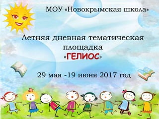 Документ описывает летнюю дневную тематическую площадку 'Гелиос' в Моу 'Новокрымская школа', которая пройдет с 29 мая по 19 июня 2017 года. В нем указано расписание мероприятий, включая прием детей, утреннюю зарядку, воспитательные мероприятия, спортивные игры и развлечения по интересам. Завершение дня запланировано с подведением итогов и уходом детей домой.