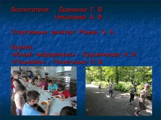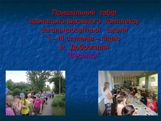 Документ описывает пришкольный лагерь 'Веселка' в Доброполье, где проходят занятия и кружки для детей. Воспитатели и их спортивные занятия создают атмосферу дружбы и веселья, что делает лагерь популярным среди детей. Они проводят время с музыкой, смехом и активно участвуют в различных мероприятиях.
