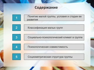 Документ рассматривает понятие малой группы, включая ее условия развития, классификации, социально-психологический климат и психологическую совместимость. Описываются этапы создания группы и влияние различных факторов на группу, такие как макро- и микросреда. Также рассматриваются критерии оценки совместимости членов группы и социометрическая структура взаимных предпочтений.