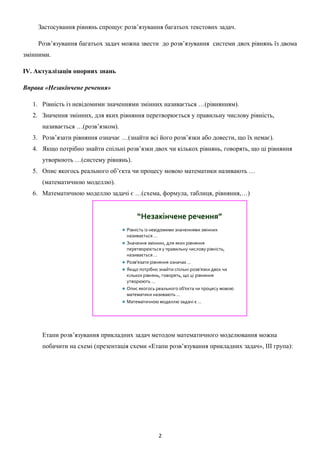 Мета: ознайомити учнів із технологією розв’язування текстових задач складанням систем