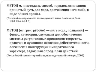 Документ рассматривает общенаучные методы познания и их применение в методических системах предметного обучения. Он классифицирует методы научного познания на общие, частные и дисциплинарные, а также на эмпирические и теоретические. Основное внимание уделяется изучению закономерностей и характеристик методов, применяемых в различных областях науки.