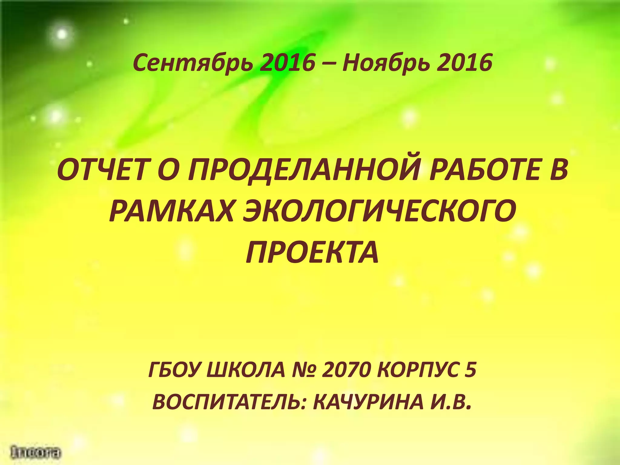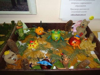 Документ является отчетом о проведении экологического проекта в детском саду, который включает конкурсы и выставки, посвященные осени, а также мероприятия по экологии и уважению к природе. В рамках проекта были организованы конкурсы рисунков, поделок из природных материалов и фотоконкурс, а также различные встречи и консультации для воспитателей. Основные цели включают развитие экологической культуры, детской фантазии и совместной деятельности между детьми и родителями.