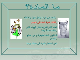 المادة هي كل ما يشغل حيزًا وله كتلة، ويمكن أن تكون طبيعية أو من صنع الإنسان. تتواجد المواد في حالات مختلفة: صلبة، سائلة، أو غازية، ولكل منها خصائص مختلفة يمكن قياسها. يستخدم الميزان والمسطرة لقياس الكتلة والأبعاد، بينما تستخدم الكؤوس المدرجة لقياس حجم السوائل.