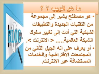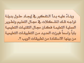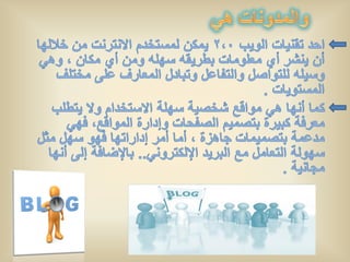 تناقش الوثيقة تاريخ التطور في التدوين منذ العصور القديمة وتعرفه كوسيلة لتوثيق الأفكار والمعلومات. كما تسلط الضوء على خصائص المدونات، نوعيّتها، ومكوناتها، بالإضافة إلى فوائدها في دعم التعليم وتحفيز التعاون بين المتعلمين. تشير الوثيقة أيضًا إلى الإحصائيات المتعلقة بنمو المدونات وتوفر بعض الأمثلة لمنصات التدوين الشائعة.