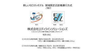 2015年5月15日 「タクシー運行支援装置およびタクシー運行支援システム」 株式会社エディラインソリューションズ ハコモノとハコブモノを繋ぐ地域公共交通コンサルティング ビジネスモデル特許出願 特願2015‐70375 2015年3月30日 「タクシー予約システム、タクシー予約装置およびタクシー予約方法」 松田 吉広 B2B B2GB2C