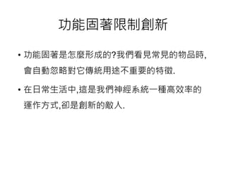 功能固著限制創新 • 功能固著是怎麼形成的?我們看見常見的物品時, 會自動忽略對它傳統用途不重要的特徵. • 在日常生活中,這是我們神經系統一種高效率的 運作方式,卻是創新的敵人.