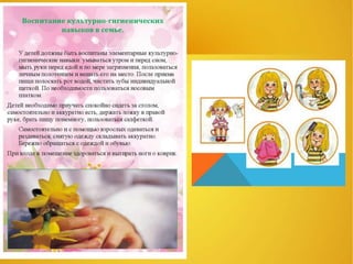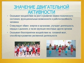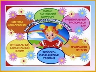 Документ описывает важность рационального распорядка дня для сохранения здоровья детей и необходимость синхронизации режима дня в детском саду и дома. Освещаются эколого-гигиенические условия и требования к двигательной активности, а также призыв к родителям внедрять здоровый образ жизни и проводить закаливание. Основное внимание уделяется созданию благоприятной среды для физического и психического развития ребенка.