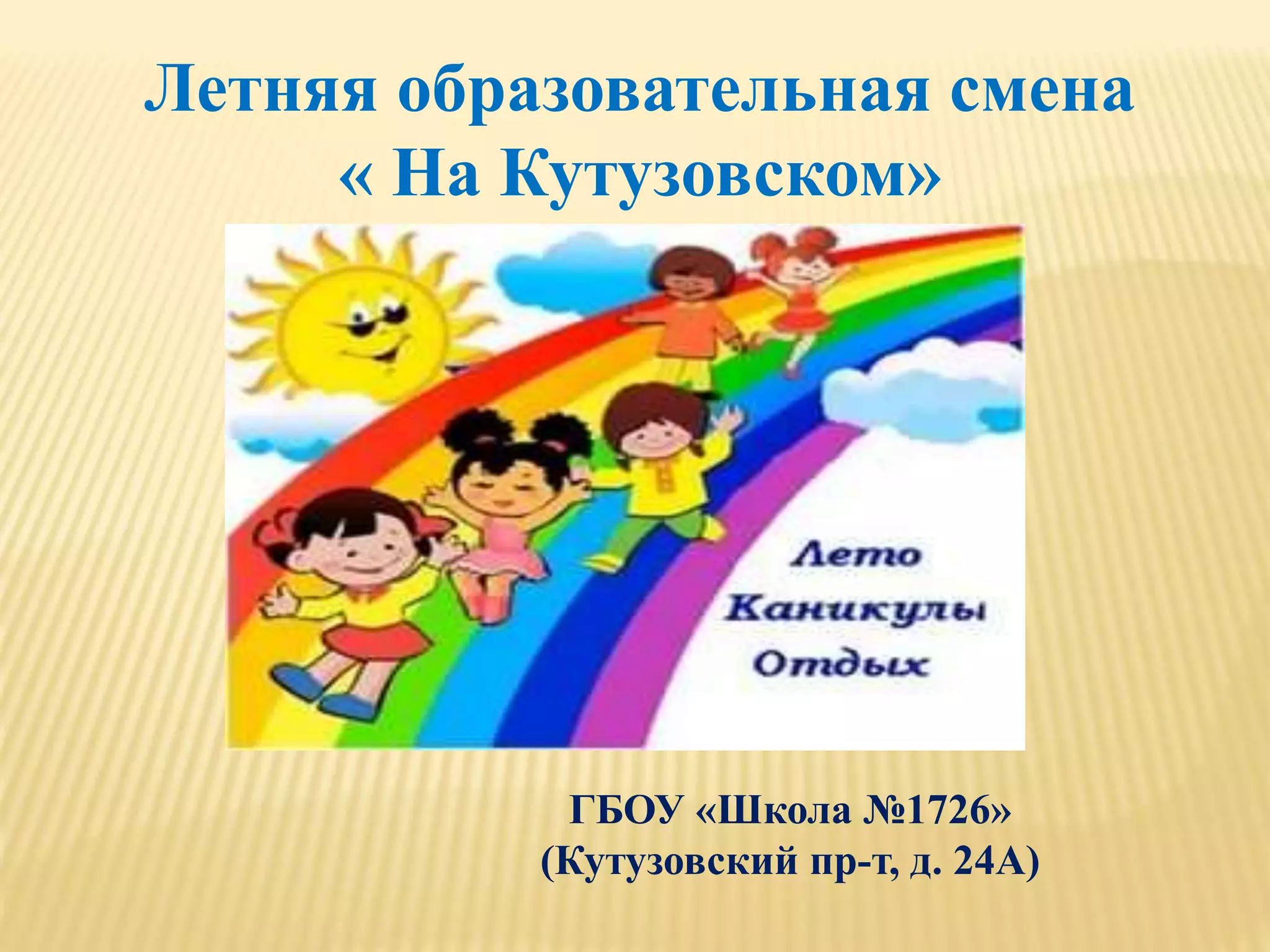 В гбоу «школа no1726» с 01.06 по 30.06.2017 года прошла летняя образовательная смена «на кутузовском», где участвовали 100 учащихся с 1 по 7 класс. В программе смены были экскурсии, мастер-классы, спортивные мероприятия и творческие конкурсы, что позволило детям проявлять свою индивидуальность и творческий потенциал. По итогам опроса, большинство участников выразили положительное мнение о проведённых мероприятиях и возможности активного отдыха.