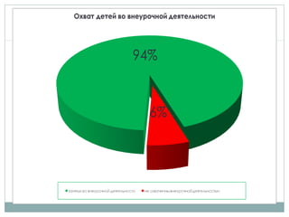Документ описывает значение внеурочной деятельности в контексте ФГОС, подчеркивая, что основная цель заключается в создании условий для реализации потребностей и интересов детей. Внеурочная деятельность организована по различным направлениям, включая общеинтеллектуальное, социальное, общекультурное, духовно-нравственное и спортивно-оздоровительное, с высоким уровнем охвата учащихся. В школе охвачено 94% учащихся 1-4 классов, что свидетельствует о значительном внимании к развитию детей вне рамок обычных учебных занятий.