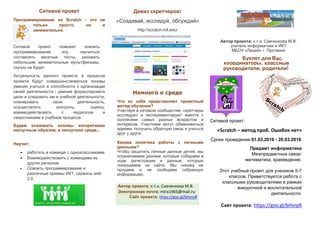 Сетевой проект по программированию на Scratch предлагает учащимся 5-7 классов научиться создавать игры, тесты и анимации, развивая навыки работы в команде и цифровую грамотность. Проект включает исследования городских улиц и создание различных сетевых продуктов, таких как презентации и ментальные карты, а также обеспечивает защиту личных данных участников. Он проходит с 01.02.2016 по 20.03.2016 и требует согласия и поддержки родителей для участия детей.