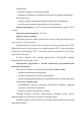 Документ представляет собой описание дополнительной общеразвивающей программы «Мой первый робот» для детей 8-12 лет, направленной на обучение основам робототехники с использованием конструктора LEGO Mindstorms NXT 2.0. Программа включает 18 часов обучения, охватывающего темы конструирования, механики и работы с роботами, и ставит цель развить интерес к техническим наукам. В конце курса обучающиеся демонстрируют свои работы на итоговой выставке.