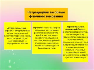 • фізичні вправи (гімнастика, ігри, елементи спорту і