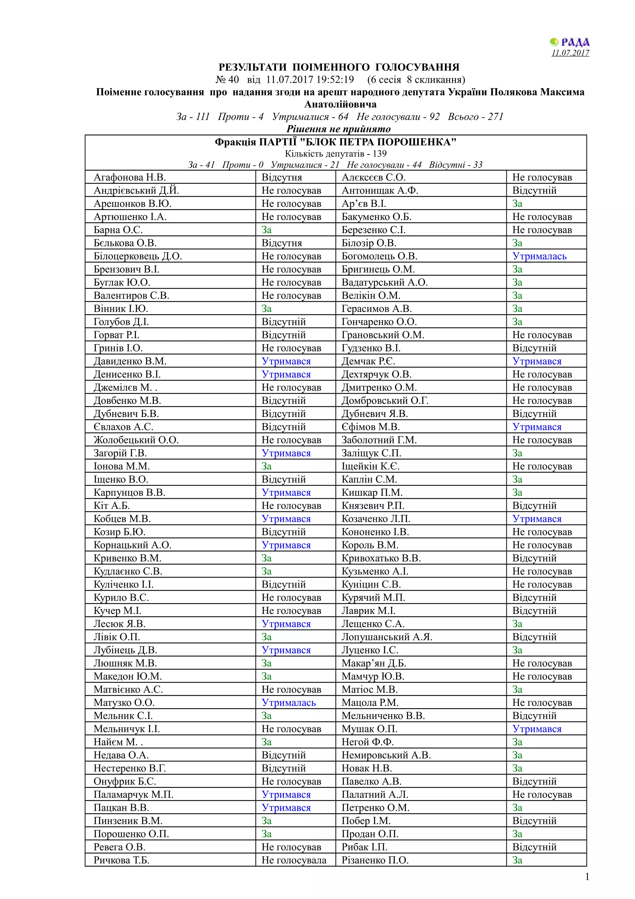 Поіменне голосування про надання згоди на арешт народного депутата України Полякова Максима