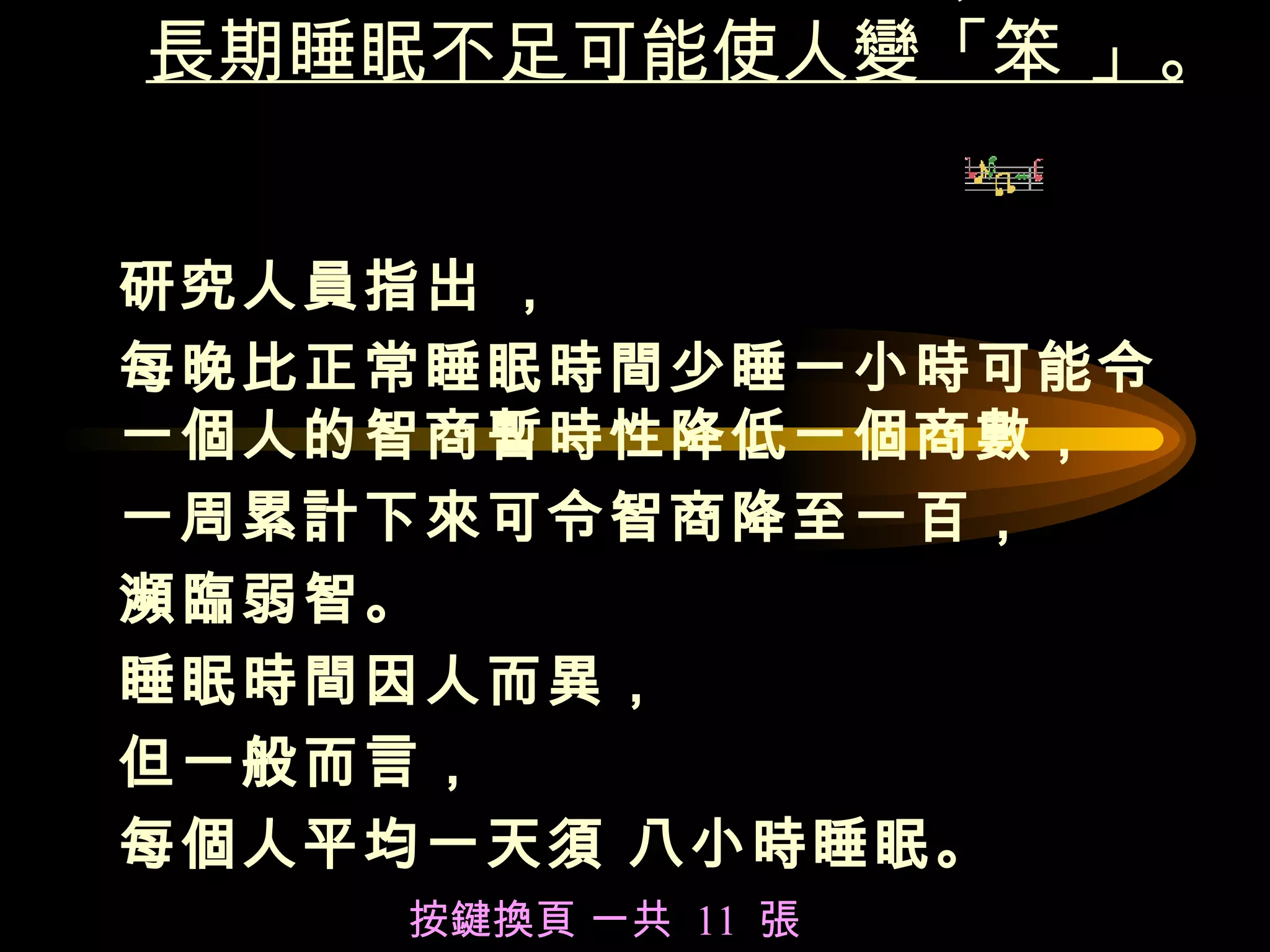 研究人員指出 , 每晚比正常睡眠時間少睡一小時可能令一個人的智商暫時性降低一個商數, 一周累計下來可令智商降至一百, 瀕臨弱智。 睡眠時間因人而異, 但一般而言, 每個人平均一天須 八小時睡眠。 按鍵換頁 一共 11 張